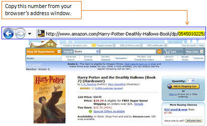 The quickest way to find your product's ASIN is to look in your browser's address bar. Copy the number that appears after the item name and "dp" in the address: